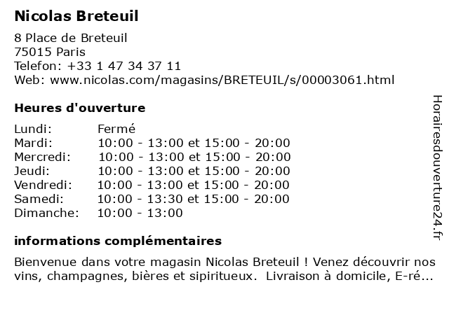 1 Nicolas (Distance: 0,01 km) 8 Place Breteuil, 75015 Paris champagnes, hyper-supermarchés, nectars, nicolas, vente au détail de vin, vin 3 Boucherie de Breteuil (Distance: 0,12 km) 41 Avenue de Saxe, 75007 Paris artisan, boucher, boucherie, breteuil, charcuterie, charcutier, de, poissonnerie, rotisserie, viande 4 Dr Nicolas Dion - Anesthésiste (Distance: 0,31 km) 149 rue de Sèvres, 75015 Paris anesthésiste, consultation, dion, docteur, dr, med, medecine, medical, médecin, nicolas, traitement 5 Nicolas Sevres (Distance: 0,43 km) 67 Boulevard des Invalides, 75007 Paris champagnes, cidre, nicolas, rhums, rosé, ruinart, sevres, spiritueux, vins, vins blancs, vins rouges, whiskies 6 Nicolas (Distance: 0,44 km) 67 Boulevard des Invalides, 75007 Paris champagnes, hyper-supermarchés, nectars, nicolas, vente au détail de vin, vin |