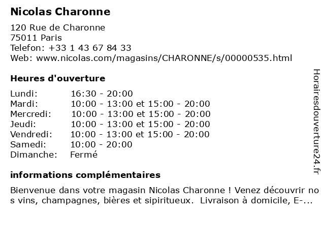 1 Grande Pharmacie de Charonne (Distance: 0,02 km) 127 Rue De Charonne, 75011 Paris charonne, de, grande, médicaments, paramédical, parapharmacie, pharmacie 2 Nicolas (Distance: 0,03 km) 120 Rue de Charonne, 75011 Paris champagnes, hyper-supermarchés, nectars, nicolas, vente au détail de vin, vin 3 Le Repaire de Charonne - RPR (Distance: 0,05 km) 114 Rue de Charonne, 75011 Paris alcool, bar, charonne, cocktail, de, le, repaire, restauration, rpr 4 Luggage Storage Charonne Metro Station - Radical Storage (Distance: 0,06 km) 173 Boulevard Voltaire, 75011 Paris charonne, luggage, luggage storage, luggage storage near me, metro, radical, station, storage 5 Opticien Paris - Optic 2000 - Métro Charonne (Distance: 0,08 km) 165 Boulevard Voltaire, 75011 Paris 2000, charonne, lentilles de contact, lunettes de soleil, lunettes de vue, métro, optic, optic2000, opticien, opticien optic2000, paris, ray-ban, rayban 6 Ménage et repassage à domicile - Shiva Paris 11ème Charonne (Distance: 0,09 km) 43 Rue Léon Frot, 75011 Paris 11ème, charonne, domicile, et, ménage, paris, repassage, shiva |
