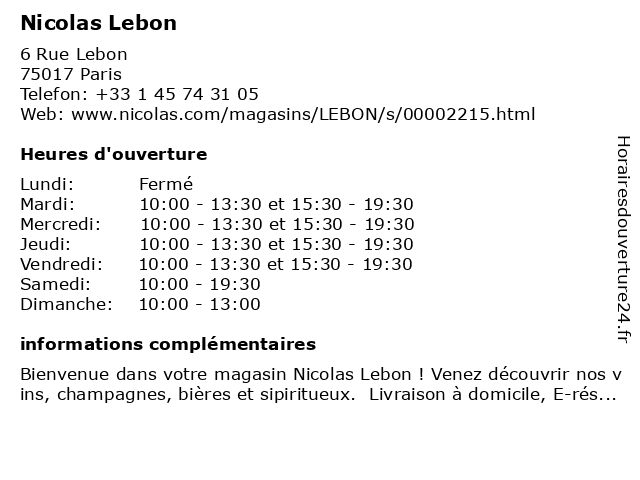 1 Lebon Opticien (Distance: 0,00 km) 6 rue Lebon, 75017 Paris lebon, lunettes, monture, opticien, optique, solaire, vue 2 Pharmacie Lebon (Distance: 0,02 km) 5 rue Lebon, 75017 Paris conseil, lebon, médicaments, pharmacie, santé, sooin 3 Nicolas Appert - Masseur-kinésithérapeute (Distance: 0,14 km) 25 Rue Pierre Demours, 75017 Paris appert, kiné, kinésithérapeute, masseur, nicolas, rééducation, soin 4 Nicolas (Distance: 0,33 km) 3 Rue Bayen, 75017 Paris champagnes, hyper-supermarchés, nectars, nicolas, vente au détail de vin, vin 5 Nicolas Ancelin - Masseur-kinésithérapeute (Distance: 0,33 km) 8 Rue Saussier-Leroy, 75017 Paris ancelin, docteur, kine, kinesitherapeute, kinésithérapeute, masseur, nicolas 6 Maître Céline Nicolas - Avocate (Distance: 0,36 km) 41 rue des Acacias, 75017 Paris avocate, avocats, cabinet, conseils, contentieux, céline, juridique, justice, litiges, maître, nicolas, services |