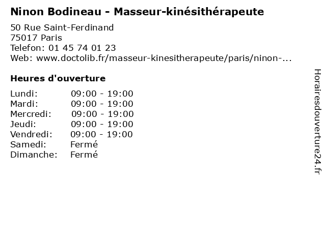 1 Maître Ninon Couanet - Avocate (Distance: 2,46 km) 11 rue Portalis, 75008 Paris avocate, avocats, cabinet, conseils, contentieux, couanet, juridique, justice, litiges, maître, ninon, services 2 Ninon Branche - Chiropracteur (Distance: 3,43 km) 84 Avenue Emile Zola, 75015 Paris branche, chiropracteur, chiroprateur, chiropraticien, ninon, sante, soins 3 Ninon Gille - Ostéopathe (Distance: 21,91 km) 64 Rue des Beaux Vents, 95310 Saint-Ouen-l'Aumône gille, ninon, ostéo, ostéopathe, ostéopathes, soins 4 Lucie Bodineau - Infirmière (Distance: 46,65 km) 2 Boulevard Sully, 78200 Mantes-la-Jolie bodineau, consultation, docteur, infirmière, lucie, med, médecin, traitement 5 Sandra Ghenassia - Masseur-kinésithérapeute (Distance: 0,00 km) 50 Rue Saint-Ferdinand, 75017 Paris ghenassia, kiné, kinésithérapeute, masseur, rééducation, sandra, soin 6 Arnaud Jacoberger - Masseur-kinésithérapeute (Distance: 0,00 km) 50 Rue Saint-Ferdinand, 75017 Paris arnaud, jacoberger, kiné, kinésithérapeute, masseur, rééducation, soin |