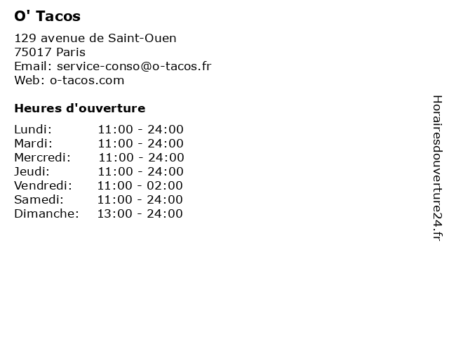1 O' Tacos (Distance: 1,29 km) 61 avenue Gabriel Péri, 93400 Saint-Ouen boissons, burger, frites, o', restaurant, tacos 2 O' Tacos (Distance: 1,50 km) 56 Boulevard de Clichy, 75018 Paris boissons, burger, frites, o', restaurant, tacos 3 O' Tacos (Distance: 1,73 km) 100 rue Cardinet, 75017 Paris boissons, burger, frites, o', restaurant, tacos 4 O' Tacos (Distance: 4,09 km) 172 Rue du Temple, 75003 Paris boissons, burger, frites, o', restaurant, tacos 6 O' Tacos (Distance: 4,84 km) 63 Avenue Edouard Vaillant, 93500 Pantin boissons, burger, frites, o', restaurant, tacos |
