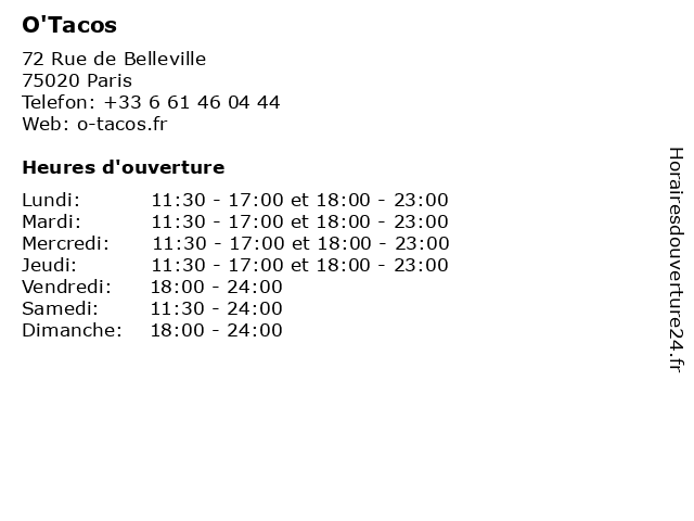 1 O'Tacos (Distance: 1,23 km) 44 rue d'Hautpoul, 75019 Paris boissons, burger, frites, o'tacos, restaurant, tacos 2 O'Tacos (Distance: 4,56 km) 101 boulevard Poniatowski, 75012 Paris boissons, burger, frites, o'tacos, restaurant, tacos 3 O'Tacos (Distance: 5,17 km) 92 rue de Patay, 75013 Paris boissons, burger, frites, o'tacos, restaurant, tacos 4 O'Tacos (Distance: 6,60 km) 83 Rue de Paris, 92110 Clichy bar, bistro, bistrot, brasserie, café, o'tacos, restaurant, restauration 5 O'Tacos (Distance: 6,86 km) 105 boulevard Grenelle, 75015 Paris boissons, burger, frites, o'tacos, restaurant, tacos 6 O'Tacos (Distance: 7,19 km) 1 rue du Cygne, 93200 Saint-Denis boissons, burger, frites, o'tacos, restaurant, tacos |