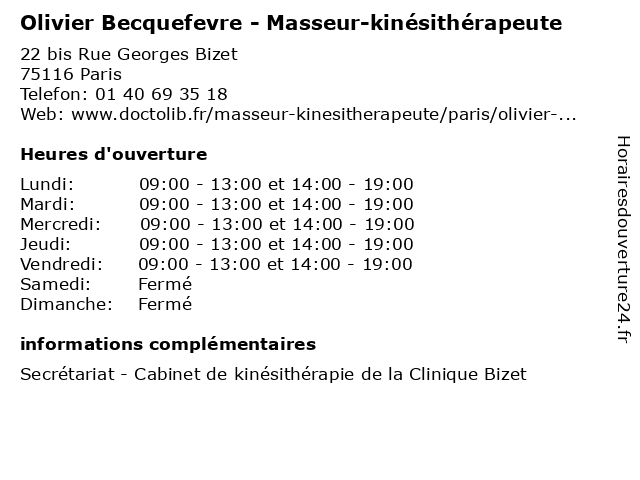 Termes de recherche pour Olivier Becquefevre - Masseur-kinésithérapeute:paris, cabinet, clinique, olivier, kinésithérapie, masseur, bizet, kinésithérapeute, 75116, becquefevre |