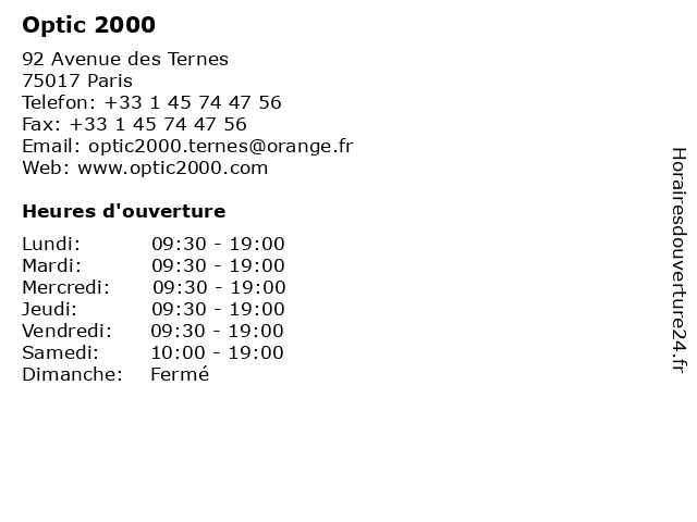 1 Optic 2000 (Distance: 1,22 km) 8 Rue de la Terrasse, 75017 Paris 2000, lunettes, optic, santé, solaires 3 Optic 2000 (Distance: 1,55 km) 37 Rue Saint Didier, 75016 Paris 2000, lunettes, optic, santé, solaires 4 Optic 2000 (Distance: 1,65 km) 16 Rue des Belles Feuilles, 75116 Paris 2000, accessoires, beaute&sante, cafe, chaussures, enfants, mode femmes, mode hommes, optic, optique, restaurant, service, sport 5 Optic 2000 (Distance: 2,20 km) 101 Avenue de Clichy, 75017 Paris 2000, lunettes, optic, santé, solaires 6 |