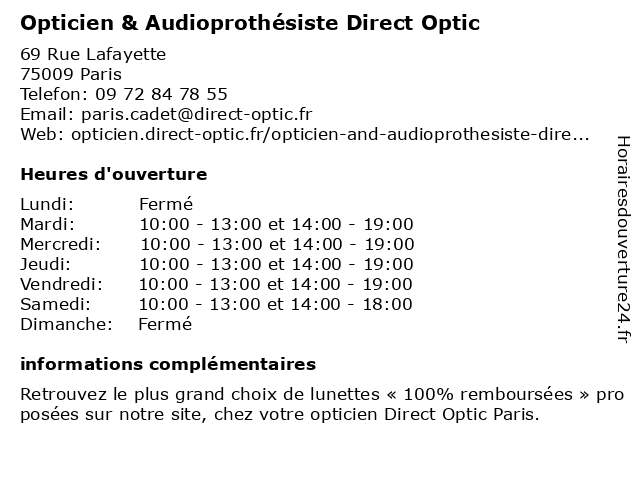 1 Direct Optic (Distance: 0,01 km) 69 rue La Fayette, 75009 Paris direct, lentilles de contact, lunettes, optic, opticien, optique, solaire, vision, vue 2 Relais Colis® / OPTIC CADET (Distance: 0,04 km) 72 RUE CADET, 75009 Paris cadet, colis, colis®, optic, relais, services postaux et de livraison 3 Apsara Optic (Distance: 0,47 km) 48 rue Laffitte, 75009 Paris apsara, lunettes, optic, opticien, optique 4 My Little Optic (Distance: 0,66 km) 37 Rue Saint-Lazare, 75009 Paris little, lunettes, monture, my, optic, opticien, optique, solaire, vue 5 Chir Optic (Distance: 0,90 km) 73 Boulevard De Strasbourg, 75010 Paris chir, divers, détail, magasins, nra, optic 6 ACUITIS Opticien & Audioprothésiste Paris 9e St Lazare (Distance: 1,12 km) 82 Rue Saint-Lazare, 75009 Paris 9e, acuitis, audiologiste, audioprothesiste, audioprothésiste, lazare, magasin d'appareils auditifs, magasin de lentilles de contact, magasin de lunettes de soleil, opticien, optometrie, paris, st |