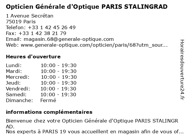 1 Generale d'Optique (Distance: 0,00 km) 1 Avenue Secretan, 75019 Paris care, clinic, d'optique, doctor, generale, health, optic, opticiens, optique, vision 2 Opticien PARIS Jaurès | Alain Afflelou (Distance: 0,01 km) 1 Avenue Secrétan, 75019 PARIS afflelou, alain, jaurès, magasin de lunettes de soleil, magasin d’accessoires de mode, opticien, optométrie, paris 3 Opticien Ness (Distance: 0,30 km) 123 avenue Simon Bolivar, 75019 Paris lunettes, monture, ness, opticien, optique, solaire, vue 4 Stalingrad Piercing Paris (Distance: 0,31 km) 22 Avenue de Flandre, 75019 Paris art shop, beauty, body ink, business, paris, piercing, skin, stalingrad, tattoo 5 L'Opticien (Distance: 0,51 km) 42 rue d'Aubervillers, 75019 Paris l'opticien, lunettes, monture, opticien, optique, solaire, vue 6 Opticien Regard du Nord (Distance: 1,28 km) 1 boulevard de Denain, 75010 Paris du, lunettes, monture, nord, opticien, optique, regard, solaire, vue |