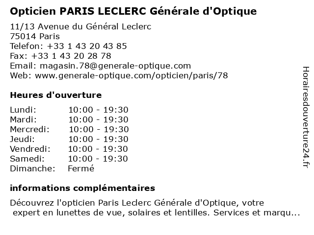1 Opticien Générale d'Optique PARIS LECLERC (Distance: 0,01 km) 11/13 Avenue du Général Leclerc, 75014 Paris d'optique, générale, leclerc, opticien, paris 2 OPTIC DUROC - OPTICIEN & AUDIOPROTHESISTE - PARIS 14 (Distance: 0,18 km) 19 Avenue du Général Leclerc, 75014 Paris 14, audioprothesiste, duroc, optic, opticien, paris 3 Lissac l'Opticien Paris 14 (Distance: 0,23 km) 18 Rue Boulard, 75014 Paris 14, l'opticien, lentilles de contact, lissac, lunettes de soleil, lunettes de vue, opticien, opticien lissac, paris 4 ACUITIS Opticien & Audioprothésiste Paris 14e General Leclerc (Distance: 0,29 km) 33 Avenue du Général Leclerc, 75014 Paris 14e, acuitis, audiologiste, audioprothesiste, audioprothésiste, general, leclerc, magasin d'appareils auditifs, magasin de lentilles de contact, magasin de lunettes de soleil, opticien, optometrie, paris 5 Opticien PARIS 14 | Alain Afflelou (Distance: 0,32 km) 50 Avenue Du Général Leclerc, 75014 PARIS 14, afflelou, alain, magasin de lunettes de soleil, magasin d’accessoires de mode, opticien, optométrie, paris 6 L'Opticien Au Service de Vos Yeux (Distance: 0,34 km) 46 rue Daguerre, 75014 Paris au, de, l'opticien, lunettes, monture, opticien, optique, service, solaire, vos, vue, yeux |