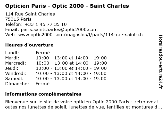 1 Optique & Audition du Village Saint Charles (Distance: 0,01 km) 114 rue Saint Charles, 75015 Paris audition, charles, du, lunettes, monture, opticien, optique, saint, solaire, village, vue 2 Marché Saint-Charles (Distance: 0,02 km) n/a Rue Saint-Charles, 75015 Paris charles, equipement, l'heure, livre, marché, médiathèque, saint, services 3 Appart Rue Saint Charles (Distance: 0,07 km) 127 Rue Saint Charles, 75015 Paris appart, charles, rue, saint 4 Jeff de Bruges - Paris 15 St Charles (Distance: 0,10 km) 131 Rue Saint Charles, 75015 Paris 15, bruges, charles, de, jeff, paris, st 5 Richard Nabet Opticien (Distance: 0,72 km) 84 Rue du Commerce, 75015 Paris lunettes, monture, nabet, opticien, optique, richard, solaire, vue 6 Opticien PARIS 15 | Alain Afflelou (Distance: 0,74 km) 89 Rue Du Commerce, 75015 PARIS 15, afflelou, alain, magasin de lunettes de soleil, magasin d’accessoires de mode, opticien, optométrie, paris |