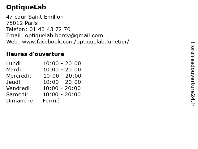 2 Paris Optic (Distance: 0,50 km) 260 Rue de Charenton, 75012 Paris lentille, lunette, monture, optic, opticien, optique, paris, vue 3 Optical Erets (Distance: 0,53 km) 231 Rue de Charenton, 75012 Paris erets, lunettes, monture, optical, opticien, optique, solaire, vue 4 Eyes Shop (Distance: 0,55 km) 4 Rue Taine, 75012 Paris eyes, lunettes, monture, opticien, optique, shop, solaire, vue 5 Opticaprice (Distance: 0,62 km) 25 Rue de Wattignies, 75012 Paris lentille, lunette, opticaprice, opticien, optique, vue 6 Vision 12 Optique (Distance: 0,64 km) 3 Boulevard de Reuilly, 75012 Paris 12, lunettes, monture, opticien, optique, solaire, vision, vue |