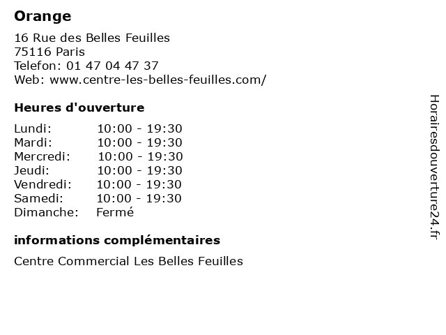 1 Orange (Distance: 2,16 km) 56 Rue Linois, 75015 Paris accessoires, box, internet, mobile, orange, téléphonie 2 Orange (Distance: 3,09 km) 31 Rue d Alsace, 92300 Levallois alimentation, beauté & santé, culture & loisirs, enfants, high-tech, maison & déco, mode, orange, restaurants 3 Orange (Distance: 3,95 km) 22 Rue du Départ, 75015 Paris beaute, cafe, chaussures, enfants, mode femmes, mode hommes, orange, restaurant, sport 4 Orange (Distance: 4,76 km) 120 rue Rambuteau, 75001 Paris accessoires, box, internet, mobile, orange, téléphonie 5 Orange (Distance: 7,96 km) 98 Boulevard Masséna, 75013 Paris beaute, cafe, chaussures, enfants, lingerie, mode femmes, mode hommes, orange, restaurant, sport 6 Orange (Distance: 8,92 km) 50 Avenue du Maréchal Foch, 95100 Argenteuil beaute, cafe, chaussures, enfants, lingerie, mode femmes, mode hommes, orange, restaurant, sport |
