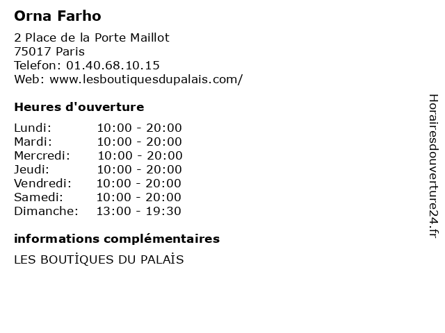 1 Orna Farho (Distance: 5,30 km) 108 boulevard de Sébastopol, 75003 Paris accessoires, boutique, farho, habillements, mode, orna, vêtements 2 ADEQUATION (Distance: 0,00 km) 2 Place de la Porte Maillot, 75017 Paris accessoires, adequation, beaute&sante, cafe, chaussures, enfants, mode femmes, mode hommes, optique, restaurant, service, sport 3 Air France (Distance: 0,00 km) 2 Place de la Porte Maillot, 75017 Paris accessoires, air, beaute&sante, cafe, chaussures, enfants, france, mode femmes, mode hommes, optique, restaurant, service, sport 4 BE SHOO (Distance: 0,00 km) 2 Place de la Porte Maillot, 75017 Paris accessoires, be, beaute&sante, cafe, chaussures, enfants, mode femmes, mode hommes, optique, restaurant, service, shoo, sport 5 Boss (Distance: 0,00 km) 2 Place de la Porte Maillot, 75017 Paris accessoires, beaute&sante, boss, cafe, chaussures, enfants, mode femmes, mode hommes, optique, restaurant, service, sport 6 Bureau De Change (Distance: 0,00 km) 2 Place de la Porte Maillot, 75017 Paris accessoires, beaute&sante, bureau, cafe, change, chaussures, de, enfants, mode femmes, mode hommes, optique, restaurant, service, sport |