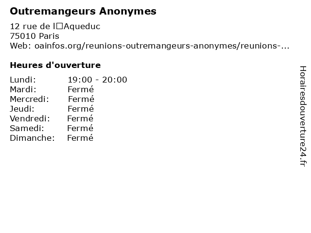 1 Outremangeurs Anonymes (Distance: 1,52 km) 10 rue Saint Elisabeth, 75003 Paris addiction, anonymes, anorexie, boulimie, hyperphagie, outremangeurs 2 Outremangeurs Anonymes (Distance: 1,52 km) 195 rue du Temple, 75003 Paris addiction, anonymes, anorexie, boulimie, hyperphagie, outremangeurs 3 Outremangeurs Anonymes (Distance: 2,37 km) 23 rue de la Sourdière, 75001 Paris addiction, anonymes, anorexie, boulimie, hyperphagie, outremangeurs 4 Outremangeurs Anonymes (Distance: 4,42 km) 105/107 rue Saint Dominique, 75007 Paris addiction, anonymes, anorexie, boulimie, hyperphagie, outremangeurs 5 Debiteurs Anonymes (Distance: 0,00 km) 12 rue de l'Aqueduc, 75010 Paris aide, anonymes, debiteurs, debiteurs anonymes, honte, problemes, reunions 6 Alcooliques Anonymes (Réunion ouverte - fermeture non définie) (Distance: 0,15 km) 12 Rue de l'Aqueduc, 75010 Paris alcooliques, anonymes, définie, fermeture, non, ouverte, réunion |