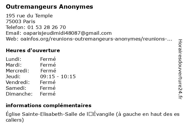 1 Outremangeurs Anonymes (Distance: 0,06 km) 10 rue Saint Elisabeth, 75003 Paris addiction, anonymes, anorexie, boulimie, hyperphagie, outremangeurs 2 Outremangeurs Anonymes (Distance: 1,52 km) 12 rue de l’Aqueduc, 75010 Paris addiction, anonymes, anorexie, boulimie, hyperphagie, outremangeurs 3 Outremangeurs Anonymes (Distance: 2,05 km) 23 rue de la Sourdière, 75001 Paris addiction, anonymes, anorexie, boulimie, hyperphagie, outremangeurs 4 Outremangeurs Anonymes (Distance: 4,05 km) 105/107 rue Saint Dominique, 75007 Paris addiction, anonymes, anorexie, boulimie, hyperphagie, outremangeurs 5 Alcooliques Anonymes (Réunion ouverte - fermeture non définie) (Distance: 0,01 km) 195 Rue du Temple, 75003 Paris alcooliques, anonymes, définie, fermeture, non, ouverte, réunion 6 Alcooliques Anonymes (Réunion fermée - fermeture non définie) (Distance: 0,01 km) 195 Rue du Temple, 75003 Paris alcooliques, anonymes, définie, fermeture, fermée, non, réunion |