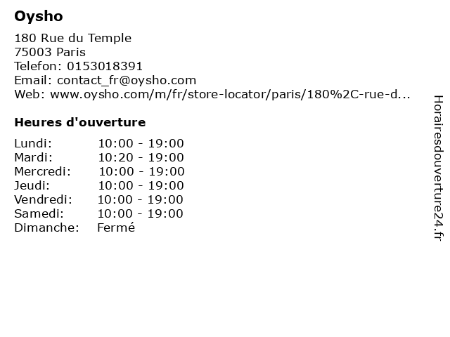 2 Oysho (Distance: 1,65 km) 101 Porte Berger, 75045 Paris chaussures, lingerie, mode enfant, mode femmes, mode hemmes, oysho, sport 3 Oysho France (Distance: 1,31 km) Ctre Cial Forum Des Halles n, 75001 Paris accessoires, divers, france, habillement, magasins, oysho 4 Oysho France (Distance: 3,71 km) 146 Rue De Rennes, 75006 Paris accessoires, divers, france, habillement, magasins, oysho 5 Eram (Distance: 0,06 km) 174 Rue du Temple, 75003 Paris accessoires, chaussures, enfants, eram, femmes, hommes, sacs 6 Sergent Major (Distance: 0,07 km) 5 Place de La Republique, 75003 Paris boutique, enfant, magasins, major, mode, sergent, services |