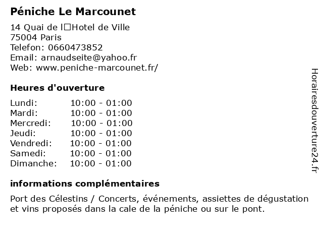 1 Péniche le Marcounet (Distance: 0,03 km) 14 Quai de l'Hôtel de Ville, 75004 Paris bar, le, marcounet, péniche, restaurant 3 OVK péniche événementielle (Distance: 1,86 km) 12 Port De La Rapée, 75012 Paris lieu de réception pour mariage, organisateur d'événements, ovk, péniche, salle de réception, traiteur, événementielle 4 Melba - Péniche événementielle (Distance: 2,49 km) Quai Anatole France Port De Solférino, 75007 Paris lieu de réception pour mariage, melba, organisateur d'événements, péniche, salle de bal, salle de réception, traiteur, événementielle 5 Péniche Touta (Distance: 7,42 km) 35 Quai De Clichy, 92110 Clichy bar, bistro, bistrot, brasserie, café, pub, péniche, restaurant, restauration, resto, touta, traiteur 6 River Café (Distance: 7,56 km) 146 Quai de Stalingrad, 92130 Issy-les-Moulineaux café, péniche, raffinée, restaurant français, river, seine, traditionnel, voiturier |