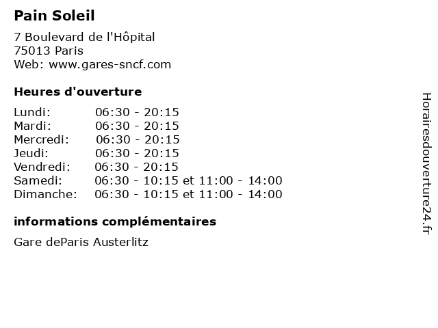 1 Pain Soleil (Distance: 3,80 km) s/n Place du 11 novembre 1918, 75010 Paris pain, restauration, services.gare, soleil, vente 2 Au Soleil d’Austerlitz (Distance: 0,06 km) 16 Boulevard de l’Hopital, 75005 Paris au, austerlitz, boissons, cuisine, d’austerlitz, repas, restaurants, soleil 3 Point Soleil (Distance: 1,11 km) 155-167 Boulevard Vincent Auriol, 75013 Paris beauté, coiffeurs, point, santé, soleil, sport 4 Lissac l'Opticien Paris 5 - Lunettes de vue, de soleil, lentilles (Distance: 1,28 km) 7 Rue Monge, 75005 Paris de, l'opticien, lentilles, lentilles de contact, lissac, lunettes, lunettes de soleil, lunettes de vue, opticien, opticien lissac, paris, soleil, vue 5 Dr Olivier Soleil - Chirurgien-dentiste (Distance: 1,47 km) 94 Rue Broca, 75013 Paris chirurgien, consultation, dentiste, docteur, dr, med, médecin, médecine, olivier, secrétariat, soleil, traitement 6 Pain Quotidien (Distance: 2,22 km) 8 rue de Bretagne, 75003 Paris bakery, breakfast, desserts, organic wine, pain, pains, quotidien |