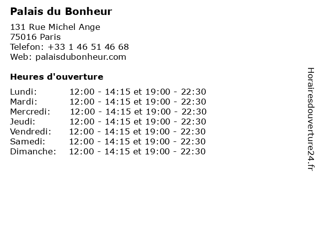 | Mardi | 12:00-14:15 et 19:00-22:30 |