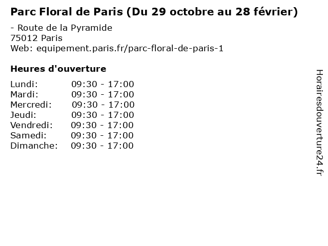 1 Parc Floral de Paris (Du 01 au 24 mars) (Distance: 0,00 km) - Route de la Pyramide, 75012 Paris 01, 24, au, de, du, floral, jardin, mars, parc, paris, square 2 Parc Floral de Paris (Du 25 mars au 30 septembre) (Distance: 0,00 km) - Route de la Pyramide, 75012 Paris 25, 30, au, de, du, floral, jardin, mars, parc, paris, septembre, square 4 Parc Floral / Du 25 octobre 2015 au 29 février 2016 (Distance: 0,69 km) n/a Avenue des Minimes, 75012 Paris 25, 29, 2015, 2016, au, du, equipement, floral, février, jardins, l'heure, livre, médiathèque, octobre, parc, pricipaux parcs, services 5 Parc Floral / Du 01 octobre 2016 au 29 octobre 2016 (Distance: 0,69 km) n/a Avenue des Minimes, 75012 Paris 01, 29, 2016, au, du, equipement, floral, jardins, l'heure, livre, médiathèque, octobre, parc, pricipaux parcs, services 6 Coulée verte René-Dumont (Du 29 octobre au 28 février) (Distance: 1,80 km) - rue Edouard-Lartet, 75012 Paris 28, 29, au, coulée, du, dumont, février, jardin, octobre, parc, rené, square, verte |