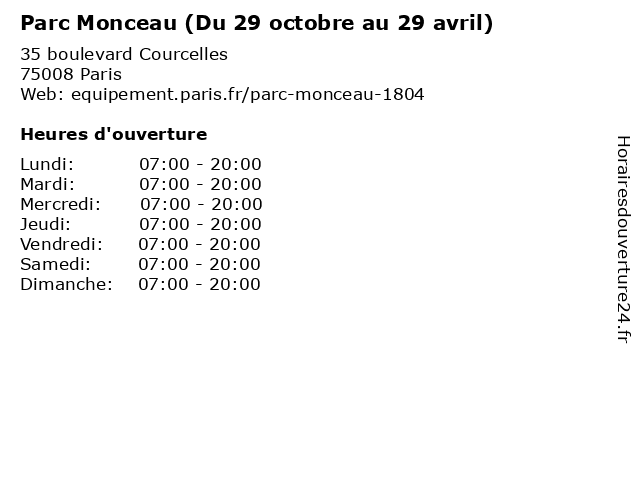 1 Parc Monceau (Du 30 avril au 31 août) (Distance: 0,00 km) 35 boulevard Courcelles, 75008 Paris 30, 31, août, au, avril, du, jardin, monceau, parc, square 2 Parc Monceau (Du 01 septembre au 30 septembre) (Distance: 0,00 km) 35 boulevard Courcelles, 75008 Paris 01, 30, au, du, jardin, monceau, parc, septembre, square 3 École primaire publique Monceau (Distance: 0,15 km) 15 rue de Monceau, 75008 Paris cours, monceau, primaire, publique, servicios, école 4 Crèche collective Monceau (Distance: 0,16 km) 13 Rue de Monceau, 75008 Paris collective, crèche, crèches, monceau, services, services à la personne 6 Pharmacie Du Parc Monceau (Distance: 0,29 km) 63 Rue De Courcelles, 75008 Paris bringer, du, grintain, monceau, parapharmacie, parc, pharmacie |