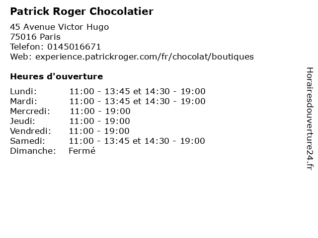 | Lundi | 11:00-13:45 et 14:30-19:00 |