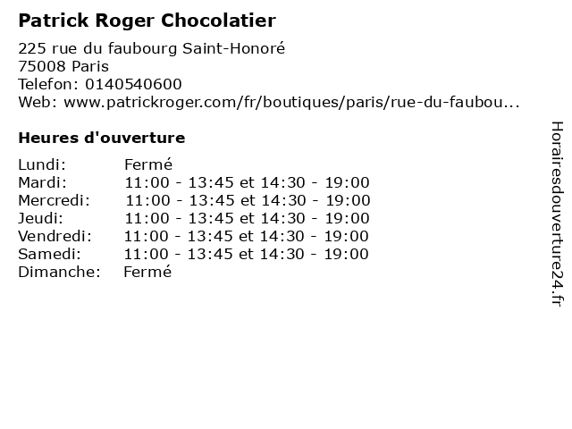| 1 Patrick Roger Chocolatier (Distance: 0,66 km) 45 Avenue Victor Hugo, 75016 Paris art, chocolat, chocolatier, creation, patrick, roger, sculpture 2 Patrick Roger Chocolatier (Distance: 1,95 km) 3 place de la Madeleine, 75008 Paris chocolaterie, chocolatier, chocolats, patrick, roger 3 Patrick Roger Chocolatier (Distance: 3,81 km) 2-4 place Saint Sulpice, 75006 Paris chocolaterie, chocolatier, chocolats, patrick, roger 4 Patrick Roger Chocolatier (Distance: 4,59 km) 43 rue des Archives, 75003 Paris chocolaterie, chocolatier, chocolats, patrick, roger 5 Patrick Roger Chocolatier (Distance: 11,06 km) 47 rue Houdan, 92330 Sceaux chocolaterie, chocolatier, chocolats, patrick, roger 6 Maître Jean-Patrick Jacob - Avocat (Distance: 0,09 km) 217 rue du Faubourg Saint-Honoré, 75008 Paris avocat, avocats, cabinet, conseils, contentieux, jacob, jean, juridique, justice, litiges, maître, patrick, services |