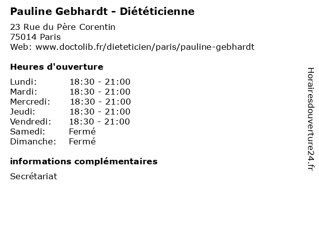 1 Aurélie Bloch - Diététicienne (Distance: 0,13 km) 30 Rue Sarrette, 75014 Paris aliment, aurélie, bloch, dieticien, diététicienne, medecin, nutrition 2 Dr Pauline Beaussart - Radiologue (Distance: 0,35 km) 119 Avenue du Général Leclerc, 75014 Paris beaussart, consultation, docteur, dr, med, médecin, pauline, radiologue, traitement 3 Leila Aboun - Diététicienne (Distance: 0,35 km) 1 Avenue Jean Moulin, 75014 Paris aboun, aliment, dieticien, diététicienne, leila, medecin, nutrition 4 Dr Pauline Marcilhacy - Chirurgien-dentiste (Distance: 0,36 km) 32 Rue Bezout, 75014 Paris chirurgien, dent, dentiste, docteur, dr, marcilhacy, pauline, soins 5 Aurélia Delgado - Diététicienne spécialisée (Distance: 0,39 km) 42 boulevard Jourdan, 75014 Paris aurélia, consultation, delgado, diététicienne, docteur, med, médecin, médecine, spécialisée, traitement 6 Catherine Le Gallo - Diététicienne spécialisée (Distance: 0,39 km) 42 boulevard Jourdan, 75014 Paris catherine, consultation, diététicienne, docteur, gallo, le, med, médecin, médecine, spécialisée, traitement |