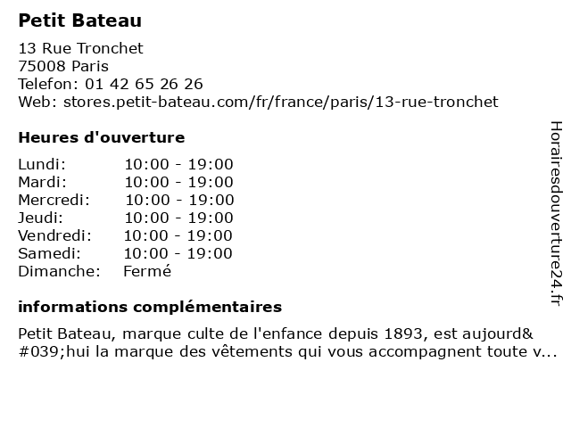 1 Petit Bateau (Distance: 0,01 km) 13 Rue Tronchet, 75008 Paris bateau, children's clothing, men's clothing, petit, women's clothing 2 Petit Bateau (Distance: 0,47 km) 1 Cour de Rome, 75008 Paris adultes, bateau, bebe, boutique, enfants, naissance, petit, vetements 3 Petit Bateau (Distance: 0,50 km) 1 Cour Du Havre, 75008 Paris bateau, magasin de t-shirts, magasin de vêtements pour enfants, magasin de vêtements pour femmes, mode, petit 4 Petit Bateau (Distance: 0,56 km) 13 Rue d'Amsterdam, 75008 Paris bateau, cafe, chaussures, enfants, homme, mode femme, petit, restaurant, service, sport 5 Petit Bateau (Distance: 0,82 km) 9 rue du 29 Juillet, 75001 Paris bateau, children's clothing, men's clothing, petit, women's clothing 6 Petit Bateau (Distance: 1,79 km) 116 Avenue Des Champs Elysées, 75008 Paris bateau, magasin de t-shirts, magasin de vêtements pour enfants, magasin de vêtements pour femmes, mode, petit |