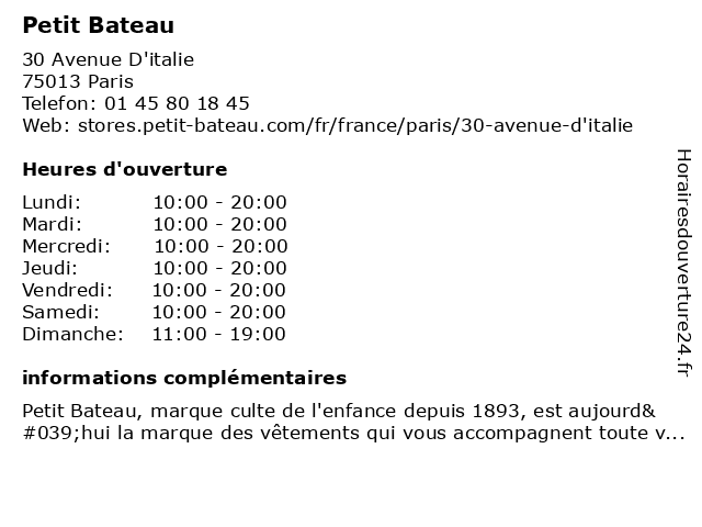1 Petit Bateau (Distance: 0,11 km) 30 Avenue d'Italie, 75013 Paris bateau, cafe, enfants.chaussures, lingerie, mode hemmes, mode homme, petit, restaurant 2 Petit Bateau (Distance: 2,46 km) 26 rue Vavin, 75006 Paris bateau, children's clothing, men's clothing, petit, women's clothing 3 Petit Bateau (Distance: 2,91 km) 67 rue du Faubourg Saint Antoine, 75011 Paris bateau, children's clothing, men's clothing, petit, women's clothing 4 Petit Bateau (Distance: 3,22 km) 53 bis rue de Sèvres, 75006 Paris bateau, children's clothing, men's clothing, petit, women's clothing 5 Petit Bateau (Distance: 4,40 km) 9 rue du 29 Juillet, 75001 Paris bateau, children's clothing, men's clothing, petit, women's clothing 6 Petit Bateau (Distance: 5,23 km) 13 Rue Tronchet, 75008 Paris bateau, children's clothing, men's clothing, petit, women's clothing |