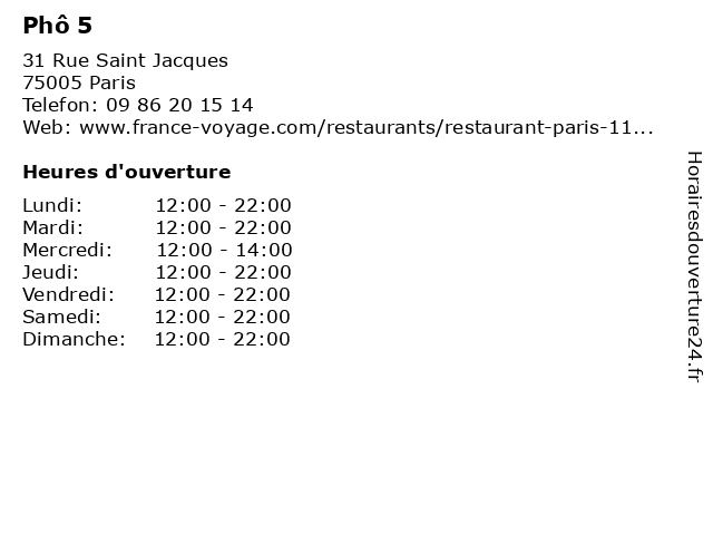 1 PHÔ Quartier Latin (Distance: 0,67 km) 33 Rue Descartes, 75005 Paris boissons, cuisine, japonais, latin, phô, quartier, repas, restaurants, sushi 2 Phô 11 (Distance: 1,95 km) 52 rue Sainte Anne, 75002 Paris 11, asiatique, pho, phô, restaurant, restauration, riz, soupe 3 Phô Miam Ben & Elise (Distance: 2,59 km) 50 Boulevard de Magenta, 75010 Paris assiatique, ben, bun, chinois, elise, emporter, miam, nems, pho, phô, restaurant, vietnamien 4 Phô Gourmet (Distance: 4,51 km) 37 Rue Desnouettes, 75015 Paris boissons, collations, gourmet, pho, phô, restaurants 5 Maison Sen (Distance: 0,14 km) 22 rue du Sommerard, 75005 Paris asiatique, maison, pho, restaurant, restauration, riz, sen, soupe 6 Le Saigon d'Antan (Distance: 0,47 km) 24 Rue Monsieur Le Prince, 75006 Paris antan, d', d'antan, le, nem, pho, restaurant, riz, rouleaux, saigon, vapeur, vermicelle, vietnamien |