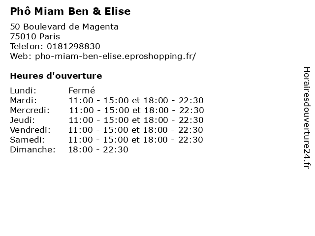 | Mercredi | 11:00-15:00 et 18:00-22:30 |