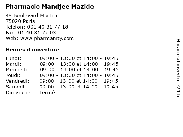 | Mardi | 09:00-13:00 et 14:00-19:45 |