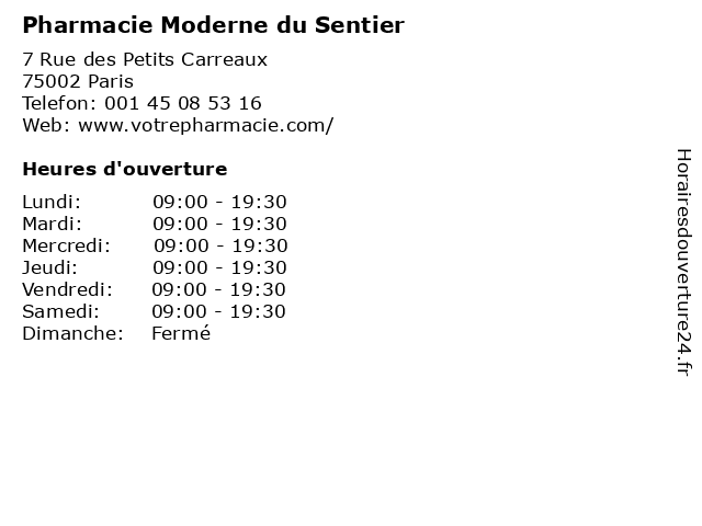 1 Pharmacie Moderne du Sentier (Distance: 0,00 km) 7 Rue des Petits Carreaux, 75003 Paris du, herboristerie, moderne, médicaments, paramédical, parapharmacie, pharmacie, pharmacien, santé, sentier, traitements 2 Pharmacie Moderne du Sentier (Distance: 0,00 km) 7 Rue des Petits Carreaux, 75002 Paris du, moderne, médicaments, pharmacie, santé, sentier, service 3 Le Sentier des Halles (Distance: 0,11 km) 50 Rue d'Aboukir, 75002 Paris bars, business, des, halles, le, music, sentier 5 Le 10h10 Clery Sentier (Distance: 0,17 km) 19 Rue de Cléry, 75002 Paris 10h10, café, clery, clery sentier, coworking, espace, le, paris, réunion, salle, sentier, travail 6 Patchwork Sentier (Distance: 0,18 km) 8 Rue de Cléry, 75002 Paris coworking, espace, paris 2, patchwork, sentier |