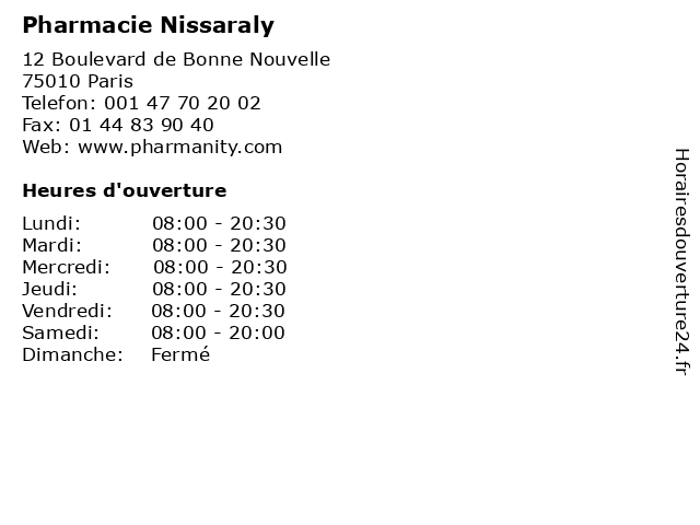 1 Pharmacie Bonne Nouvelle (Distance: 0,00 km) 12 boulevard Bonne Nouvelle, 75010 Paris bonne, homéopathie, médicaments, nouvelle, orthopédie, parapharmacie, pharmacie 2 Pharmacie du Globe (Distance: 0,10 km) 15 Boulevard de Bonne Nouvelle, 75002 Paris du, globe, médicaments, orthopédie, parapharmacie, pharmacie 3 Pharmacie Croix de Malte (Distance: 0,36 km) 53 boulevard Saint Martin, 75003 Paris aprium, croix, de, malte, médicaments, orthopédie, parapharmacie, pharmacie 4 Pharmacie des Deux Lions (Distance: 0,53 km) 49 Rue du Faubourg Poissonnière, 75009 Paris des, deux, la médecine, la pharmacie, la santé, les soins, lions, pharmacie 5 1001Pharmacies / Société Audilo (Distance: 0,87 km) 8 Passage des Deux Sœurs, 75009 Paris 1001pharmacies, audilo, la médecine, la pharmacie, la santé, les soins, pharmacie, société 6 Pharmacie de La Bourse (Distance: 0,93 km) 1 rue du 4 Septembre, 75002 Paris bourse, de, la, médicaments, orthopédie, parapharmacie, pharmacie |