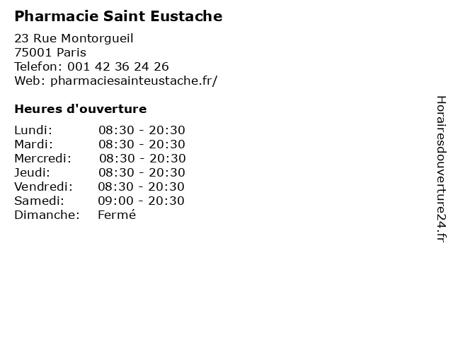 1 Pharmacie Saint Eustache (Distance: 0,00 km) 23 Rue Montorgueil, 75001 Paris eustache, médicaments, pharmacie, produits, saint, sante, services 2 L'Entrecôte Saint-Eustache (Distance: 0,06 km) 24 Rue Montmartre, 75001 Paris boucher, boucherie, charcuterie, eustache, l'entrecôte, saint, traiteur, viande, épicerie 3 Paroisse Saint-Eustache (Distance: 0,11 km) 2 Impasse Saint-Eustache, 75001 Paris chapelle, christianisme, chrétien, eustache, paroisse, pasteur, religion, saint, église 4 Marché Saint-Eustache-Les Halles (Distance: 0,11 km) n/a rue montmartre, 75001 Paris equipement, eustache, halles, l'heure, les, livre, marché, médiathèque, saint, services 5 Paroisse Saint-Eustache - rencontrer un prêtre (Distance: 0,18 km) - Rue Rambuteau, 75001 Paris chapelle, christianisme, chrétien, eustache, paroisse, pasteur, prêtre, religion, rencontrer, saint, un, église 6 Le Bistrot d'Eustache (Distance: 0,33 km) 37 rue Berger, 75001 Paris bar, bistrot, d'eustache, français, le, restaurant, soirée à thème |