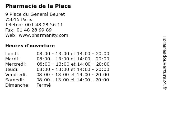 1 Pharmacie de la Place (Distance: 5,93 km) 2 rue Erard, 75012 Paris de, la, médicaments, paramédical, parapharmacie, pharmacie, place 2 Pharmacie de la Place (Distance: 16,76 km) 3 Place du General Leclerc, 93600 Aulnay Sous Bois de, herboristerie, la, médicaments, paramédical, parapharmacie, pharmacie, pharmacien, place, santé, traitements 3 Pharmacie de la Place (Distance: 19,77 km) 14 Place de la Libération, 93190 Livry-Gargan consultations, de, la, médicaments, pharmacie, place, vitamines 4 Pharmacie Place Cambronne (Distance: 0,65 km) 6 Place Cambronne, 75015 Paris cambronne, médicaments, pharmacie, place, santé, service 6 Square de la place du Commerce (Du 29 octobre au 28 février) (Distance: 0,77 km) 18 place du Commerce, 75015 Paris 28, 29, au, commerce, de, du, février, jardin, la, octobre, parc, place, square |
