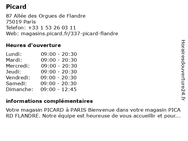 Votre magasin PICARD à PARIS Bienvenue dans votre magasin PICARD FLANDRE. Notre équipe est heureuse de vous accueillir et pourra vous conseiller avec professionnalisme et en toute simplicité. Pr...