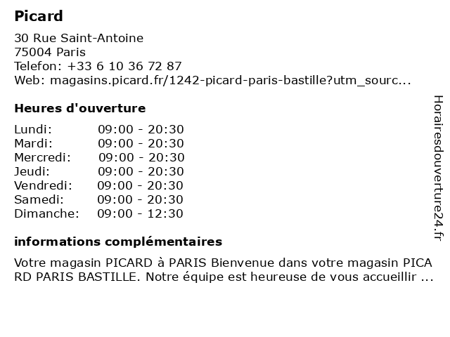 Votre magasin PICARD à PARIS Bienvenue dans votre magasin PICARD PARIS BASTILLE. Notre équipe est heureuse de vous accueillir et pourra vous conseiller avec professionnalisme et en toute simplici...
