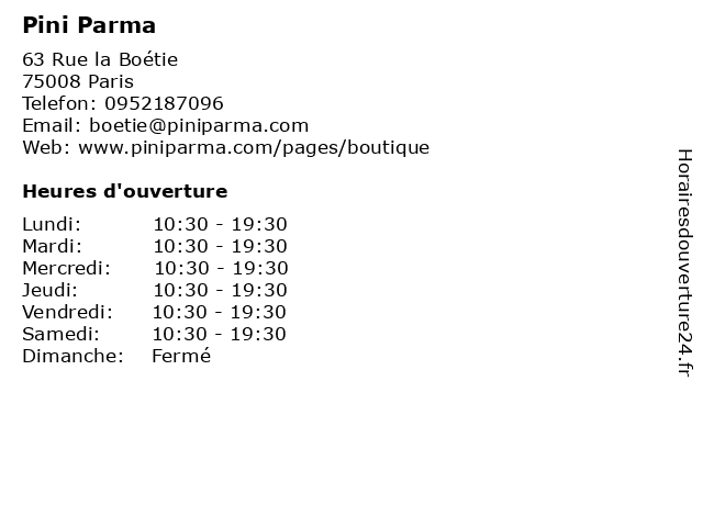 1 Pini Parma (Distance: 2,85 km) 154 Boulevard Saint-Germain, 75006 Paris boutique, chaussures, mode, parma, pini, vetement 2 3 Sapori Di Parma (Distance: 2,00 km) 56 Avenue de la Bourdonnais, 75007 Paris di, italien, parma, parme, restaurants, sapori, saveurs, épicerie 4 Sapori di Parma (Distance: 2,55 km) 80 Avenue De Suffren, 75015 Paris di, parma, parme, restaurants, sapori, saveurs 5 Parma Mia (Distance: 3,72 km) 97 Rue Blomet, 75015 Paris alimentation, charcuterie, italienne, jambon, mia, parma, épicerie 6 Acqua Di Parma (Distance: 4,22 km) 6 Rue des Francs Bourgeois, 75003 Paris acqua, boutique, crème, di, parfum, parfumerie, parma, soins |