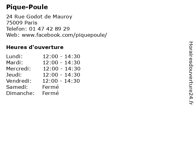 1 La Poule au Pot (Distance: 1,59 km) 9 rue Vauvilliers, 75001 Paris au, bistrot, brasserie, café, la, pot, poule, restaurant, restauration 2 Ma P'tite Poule (Distance: 1,81 km) 26 Rue Sainte Foy, 75002 Paris boissons, cuisine, kasher, ma, menus, p'tite, poule, repas, restaurants 3 Pique Nique Restaurant (Distance: 1,91 km) 14 Rue Bertin Poirée, 75001 Paris apéritif, boissons, nique, pique, restaurant 4 Café La Belle Poule (Distance: 1,99 km) 18 avenue Hoche, 75008 Paris belle, cafe, café, la, poule, restaurants 5 Papa Pique et Maman Coud (Distance: 2,60 km) 39 Rue Saint Placide, 75006 Paris accessoires, coud, creation, enfant, et, femme, maman, mode, papa, pique 6 Ô Q De Poule (Distance: 2,62 km) 53 Rue Du Ruisseau, 75018 Paris boissons, de, poule, restaurants, saldin |