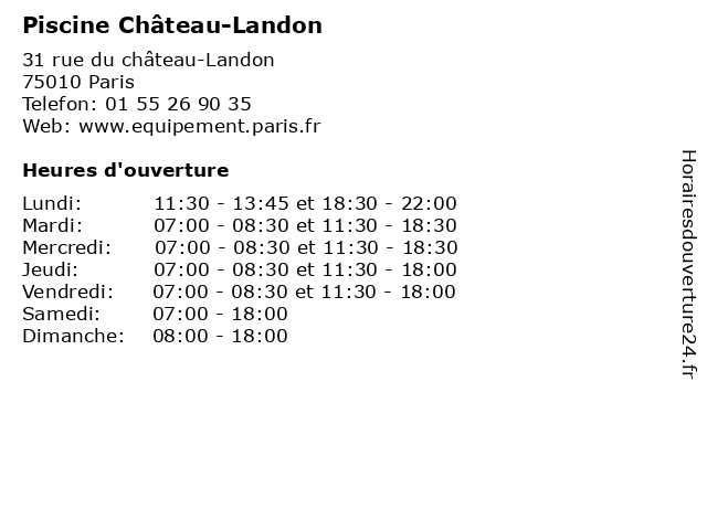 1 Centre d'animation Chateau Landon (Distance: 0,00 km) 31 rue du Chateau Landon, 75010 Paris centre, centres d'animation, chateau, d'animation, equipement, jardins, l'heure, landon, livre, médiathèque, services 2 Piscine Château-Landon (Du 21 août au 10 septembre) (Distance: 0,00 km) 31, rue du château-Landon, 75010 Paris 10, 21, 2017, août, au, château, du, formation, landon, piscine, septembre 3 Le Landon (Distance: 0,33 km) 12 Rue du Château Landon, 75010 Paris bar, bistro, bistrot, brasserie, café, landon, le, restaurant, restauration 4 Chateau Landon Fire Brigade (Distance: 0,42 km) 188 Quai de Valmy, 75010 Paris brigade, chateau, fire, landon, services, station 5 CIS Landon - SDIS 93 (Distance: 0,44 km) 188 quai de Valmy, 75010 Paris 93, cis, landon, lutte contre les incendies, pompier, protection, prévention, sdis, secours 6 Amandine Landon - Psychologue (Distance: 3,05 km) 11 Rue Bertin Poirée, 75001 Paris amandine, cabinets, landon, médecins, psychologue, secrétariat, thérapies |