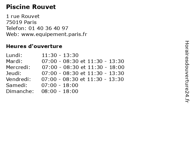 1 Piscine Rouvet / Du 20 février 2016 au 06 mars 2016 (Distance: nan km) 1 rue Rouvet, 75019 Paris 06, 20, 2016, au, du, equipement, février, joyeuse, l'heure, livre, mars, médiathèque, piscine, rouvet, services 2 Bain-Douche Rouvet (Distance: nan km) 1 rue Rouvet, 75019 Paris bain, douche, gratuite, hygiene, proprete, public, rouvet 3 Square Dampierre-Rouvet (Du 29 octobre au 28 février) (Distance: 0,12 km) 10 rue Rouvet, 75019 Paris 28, 29, au, dampierre, du, février, jardin, octobre, parc, rouvet, square 4 Square Dampierre-Rouvet (Du 01 au 24 mars) (Distance: 0,12 km) 10 rue Rouvet, 75019 Paris 01, 24, au, dampierre, du, jardin, mars, parc, rouvet, square 5 Square Dampierre-Rouvet (Du 25 mars au 29 avril et septembre) (Distance: 0,12 km) 10 rue Rouvet, 75019 Paris 25, 29, au, avril, dampierre, du, et, jardin, mars, parc, rouvet, septembre, square 6 Square Dampierre-Rouvet (Du 30 avril au 31 août) (Distance: 0,12 km) 10 rue Rouvet, 75019 Paris 30, 31, août, au, avril, dampierre, du, jardin, parc, rouvet, square |