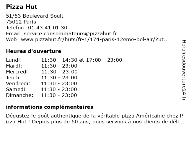 1 Pizza Hut (Distance: 2,48 km) 3 rue du Pont, 94220 Charenton-le-Pont boissons, hut, nourriture, pizza, restaurant 2 4 Pizza Hut (Distance: 4,72 km) 61 Av Paul Vaillant Couturier, 94400 Vitry-sur-seine hut, pizza, restaurants 5 Pizza Hut (Distance: 4,98 km) 1 square des Innocents, 75001 Paris alimentaires, boissons, hut, pizza, restaurant 6 Pizza Hut (Distance: 6,21 km) 2 Boulevard Albert 1er, 94130 Nogent-sur-Marne boissons, hut, nourriture, pizza, restaurant |