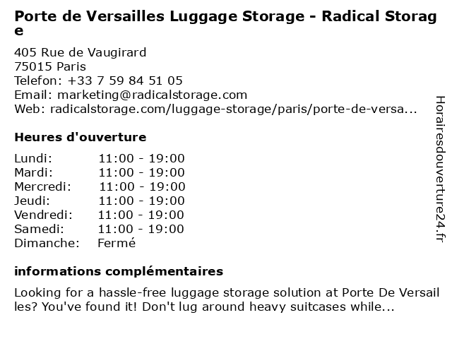 1 Porte de Versailles Luggage Storage - Radical Storage (Distance: 0,01 km) 405 Rue de Vaugirard, 75015 Paris de, luggage, luggage storage, luggage storage near me, porte, radical, storage, versailles 2 Nannybag Luggage Storage (Distance: 1,31 km) 59 Rue De Vouillé, 75015 Paris luggage, nannybag, storage 3 Radical Storage - Luggage Storage Republique Point Du Jour (Distance: 2,57 km) 58 Avenue Pierre Grenier, 92100 Boulogne-Billancourt du, jour, luggage, luggage storage, luggage storage near me, point, radical, republique, storage 4 Nannybag Luggage Storage (Distance: 2,64 km) 161 Avenue Du Maine, 75014 Paris luggage, nannybag, storage 6 Nannybag Luggage Storage - CLOSED (Distance: 7,10 km) 4 Rue De Clignancourt, 75018 Paris closed, luggage, nannybag, storage |