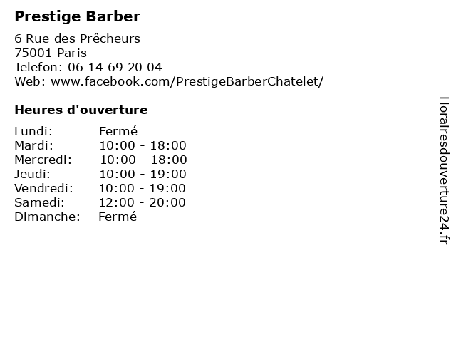 1 The Barber Company (Distance: 0,06 km) - Rue Pierre Lescot, 75001 Paris barber, barbier, beauté, coiffure, company, hommes, salon, shop, the 2 Le Loft Barber Shop (Distance: 0,34 km) 1-3 rue du Plat d'Etain, 75001 Paris barber, barbier, coiffeur, coupe, homme, le, loft, rasage, shop 3 Maison de la Literie Prestige (Distance: 0,47 km) 94 boulevard Sébastopol, 75003 Paris de, la, literie, lits, magasin de lits, magasin meubles, maison, matelas, meuble, meubles, prestige 4 Original Barber Shop (Distance: 0,48 km) 56 Rue du Temple, 75004 Paris 5original, barber, barbershop, coiffeur, coupes, original, shop 6 Maison de la Literie Prestige (Distance: 0,57 km) 20 quai de la Mégisserie, 75001 Paris de, la, literie, lits, magasin de lits, magasin meubles, maison, matelas, meuble, meubles, prestige |