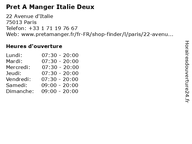 1 Pret A Manger (Distance: 1,46 km) 39-51 Avenue Pierre Mendès-France, 75013 Paris barista, brunch, café, cuisine équilibrée, dessert, jus, manger, petit déjeuner, plat chaud, pret, pâtes, salades, sandwiches, thé, végétarien 2 Pret A Manger Avenue de France (Distance: 1,58 km) 110 Avenue de France, 75013 Paris avenue, barista, brunch, café, cuisine équilibrée, de, dessert, france, jus, manger, petit déjeuner, plat chaud, pret, pâtes, salades, sandwiches, thé, végétarien 3 Pret A Manger (Distance: 2,12 km) Place Louis-Armand, 75012 Paris barista, brunch, café, cuisine équilibrée, dessert, jus, manger, petit déjeuner, plat chaud, pret, pâtes, salades, sandwiches, thé, végétarien 4 Pret A Manger (Distance: 2,89 km) 17 Boulevard de Vaugirard, 75015 Paris barista, brunch, café, cuisine équilibrée, dessert, jus, manger, petit déjeuner, plat chaud, pret, pâtes, salades, sandwiches, thé, végétarien 5 Pret A Manger Passage du Havre (Distance: 5,50 km) 109 Rue Saint-Lazare, 75009 Paris barista, brunch, café, cuisine équilibrée, dessert, du, havre, jus, manger, passage, petit déjeuner, plat chaud, pret, pâtes, salades, sandwiches, thé, végétarien 6 Pret A Manger (Distance: 6,66 km) 11 Rue Rouget de Lisle, 92130 Issy-les-Moulineaux barista, brunch, café, cuisine équilibrée, dessert, jus, manger, petit déjeuner, plat chaud, pret, pâtes, salades, sandwiches, thé, végétarien |