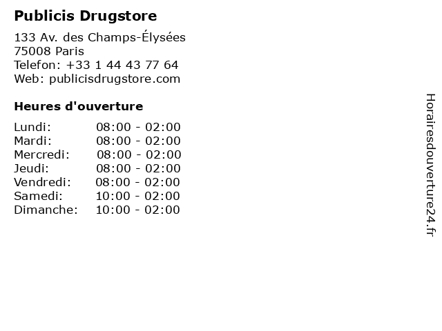 1 Publicis Drugstore (Distance: 0,04 km) 133 Avenue des Champs-Élysées, 75008 Paris bar, bistro, bistrot, brasserie, café, drugstore, publicis, restaurant, restauration 2 Ladurée Publicis Drugstore (Distance: 0,03 km) 133 Avenue Des Champs-elysées, 75008 Paris drugstore, ladurée, publicis 3 Restaurant Drugstore Publicis (Distance: 0,04 km) 133 Avenue des Champs-Élysées, 75008 Paris bistrot, brasserie, café, drugstore, publicis, restaurant, restauration 4 Le Drugstore Parisien (Distance: 2,11 km) 1 cour du Havre, 75008 Paris cheveux, cosmétique, drugstore, le, maquillage, parfum, parisien, soins 5 Le Drugstore Parisien (Distance: 2,57 km) 66 Rue de la Chaussée d 'Antin, 75009 Paris cheveux, cosmétiques, drugstore, le, maquillage, parisien, soins 6 le drugstore parisien (Distance: 2,57 km) 66 Rue de la Chaussée d'Antin, 75009 Paris bibi, carte de fidélité, courses, drugstore, le, magasin, parisien, produits frais, programme de fidélité, supermarché, épicerie |