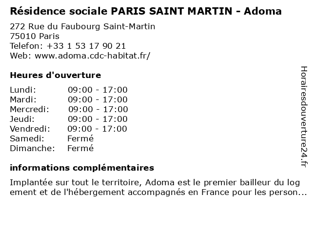 1 Résidence sociale PARIS SAINT MARTIN - Adoma (Distance: 0,00 km) 272 Rue du Faubourg Saint-Martin, 75010 Paris adoma, martin, paris, résidence, saint, sociale 2 Résidence sociale PARIS SAINT MARTIN - Adoma (Distance: 0,00 km) 272 Rue du Faubourg Saint-Martin, 75010 Paris adoma, martin, paris, résidence, saint, sociale 3 Hôtel Kyriad Canal St Martin Republique (Distance: 1,29 km) 30 Rue Lucien Sampaix, 75010 Paris bar, canal, chambres, hotel, hôtel, kyriad, martin, republique, restaurant, service, st 4 Contact Hôtel Garden Saint-Martin** (Distance: 1,44 km) 35 rue Yves Toudic, 75010 Paris contact, garden, hotel, hôtel, martin**, saint, service en chambre. 5 Marché couvert St Martin (Distance: 1,56 km) 31/33 rue du château d?eau, 75010 Paris couvert, equipement, l'heure, livre, marché, martin, médiathèque, services, st 6 Ouh Là Là! Cantine St Martin (Distance: 1,82 km) 94 Rue René Boulanger, 75010 Paris cantine, food, là, là!, martin, ouh, restaurant, st, taco |