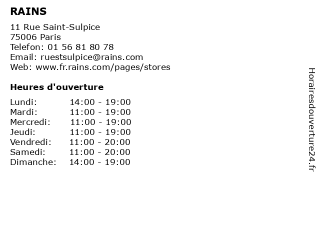1 RAINS (Distance: 1,79 km) 78 Rue du Temple, 75003 Paris accessoires, boutique, mode, prêt à porter, rains, sacs, vêtements 2 Pep's - septembre à mai (Distance: 1,80 km) 223 Rue Saint-Martin, 75003 Paris hiver, mai, parapluie, pep's, pluie, réparation, septembre, soleil 3 Après la pluie-sophrologie (Distance: 13,54 km) 2 Avenue du Maréchal Foch, 78800 Houilles après, gestion, la, maternité, pluie, relaxation, sophrologie, stress, émotions 5 Speedway (Distance: 27,67 km) 10-14 Rue du mail, 95320 St Ouen l'Aumône accessories, blouson, bottes et chaussures, casque, gants ou encore combinaison, pantalon, speedway, veste, vêtements de pluie 6 Carven (Distance: 0,00 km) 36 rue Saint-Sulpice, 75006 Paris accessoires, carven, divers, habillement, magasins |