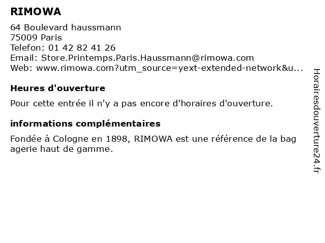 1 RIMOWA (Distance: 0,04 km) 64 Boulevard Haussmann, 75009 Paris luggage, luggage repair, luggage shop, luggage store, rimowa, suitcase, suitcase shop, suitcase store, suitcases, travel goods 3 RIMOWA (Distance: 0,30 km) 40 Boulevard Haussmann, 75009 Paris luggage, luggage repair, luggage shop, luggage store, rimowa, suitcase, suitcase shop, suitcase store, suitcases, travel goods 4 RIMOWA (Distance: 1,01 km) 73 Rue du Faubourg Saint-Honoré, 75008 Paris luggage, luggage repair, luggage shop, luggage store, rimowa, suitcase, suitcase shop, suitcase store, suitcases, travel goods 5 RIMOWA (Distance: 1,01 km) 73 Rue Du Faubourg Saint-honoré, 75008 Paris magasin d’accessoires de mode, rimowa 6 RIMOWA (Distance: 1,33 km) 99 Rue de Rivoli, 75001 Paris luggage, luggage shop, luggage store, rimowa, suitcase, suitcase shop, suitcase store, suitcases, travel goods |