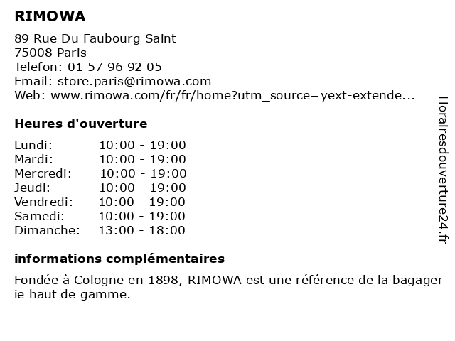 1 RIMOWA (Distance: 0,11 km) 73 Rue du Faubourg Saint-Honoré, 75008 Paris luggage, luggage repair, luggage shop, luggage store, rimowa, suitcase, suitcase shop, suitcase store, suitcases, travel goods 2 RIMOWA (Distance: 0,55 km) 60 Avenue des Champs-Élysées, 75008 Paris luggage, luggage repair, luggage shop, luggage store, rimowa, suitcase, suitcase shop, suitcase store, suitcases, travel goods 4 RIMOWA (Distance: 1,14 km) 64 Boulevard Haussmann, 75009 Paris luggage, luggage repair, luggage shop, luggage store, rimowa, suitcase, suitcase shop, suitcase store, suitcases, travel goods 6 RIMOWA (Distance: 1,39 km) 40 Boulevard Haussmann, 75009 Paris luggage, luggage repair, luggage shop, luggage store, rimowa, suitcase, suitcase shop, suitcase store, suitcases, travel goods |